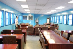 On our way into the area in the morning there were a few check points where soldiers checked passports. Camp Boifas has even more restrictions. On our way into the base, the tour guide kept updating us on how close we were getting to the Demarcation Line or Demilitarized Zone (DMZ). Soldiers took another look at our passports. We finally left for the Joint Security Area where the DMZ line is. But first we needed to see an 8 minute movie about the DMZ. We also signed our life away on some form. (It was nice knowing you all.) We picked up badges that we wore in plain sight on our shirts. Other than the movie we were also briefed about what we could do and what we could not do. Still cameras were okay to bring and snap photos inside the MAC Conference Room. Video cameras are not permitted. (So, all those You Tube videos are people that broke a very serious rule. Bad! Very bad! But thank you for sharing.)