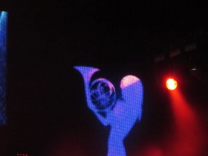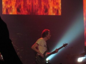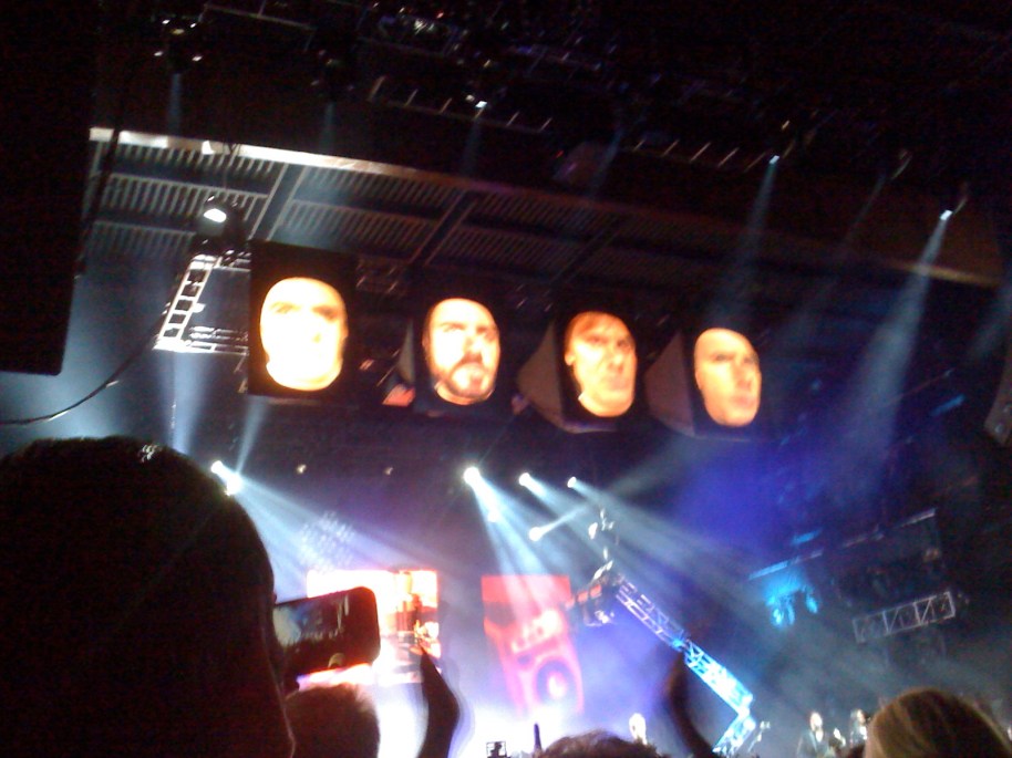 Images and videos screened on the back wall such as silhouettes of Bond girls to “A View To a Kill.” Other special effects appeared on four giant faces above the stage. Matrix-like effects accompanied new song “Blame The Machines.”